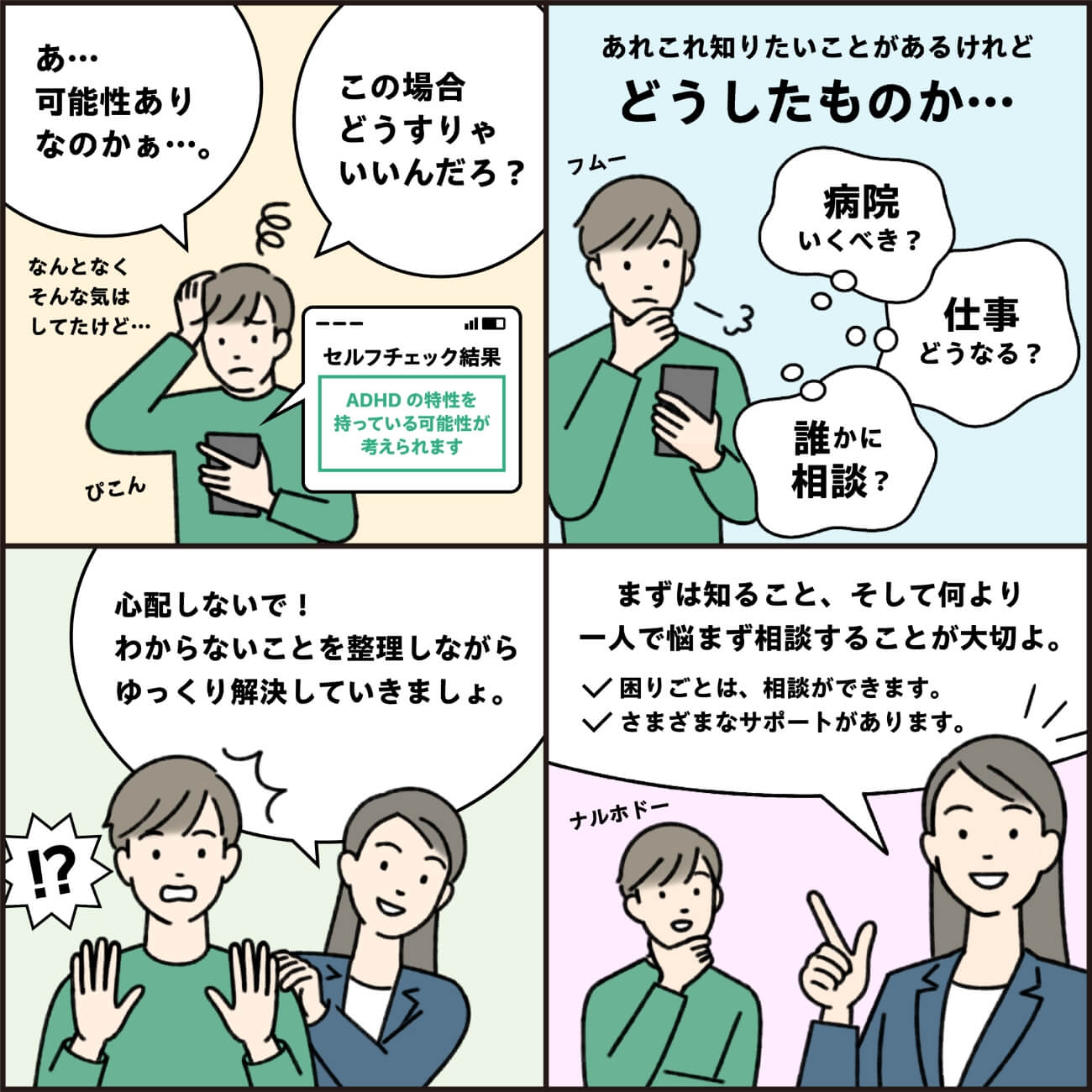 そもそも発達障害という診断名は、自分自身の特性を深く理解したり、幸せになるために必要なサポートを得るための手段として存在しています。仕事や生活の中で生きづらさを感じていて「もしかしたら発達障害かもしれない」と心配になった時には、ひとりで悩むことなく、まずは医療機関を受診してみることをお勧めします。